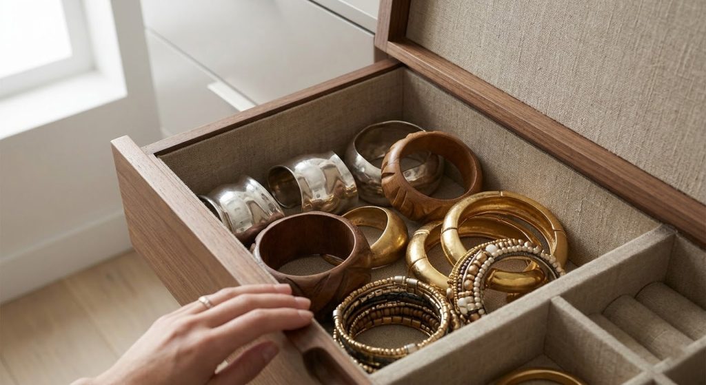 Deep-well drawers are necessary for items that do not lay flat, such as stiff bangles or beaded bracelets.