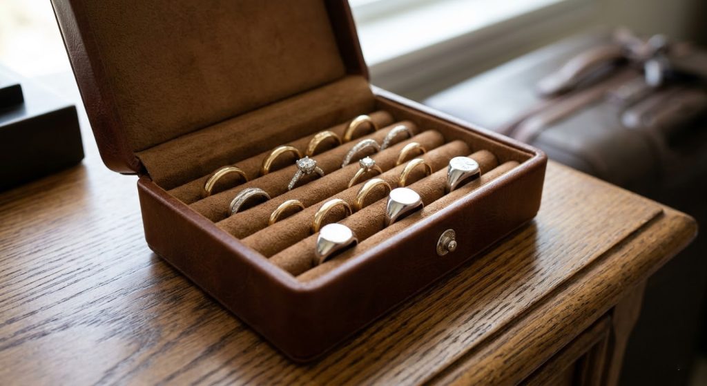 A genuine leather case is the best jewelry box for rings due to its durable exterior and specialized padded rolls that secure bands in place. Internal channels protect the shanks of your rings from colliding, which is essential for maintaining the finish of high-polish gold and platinum bands.