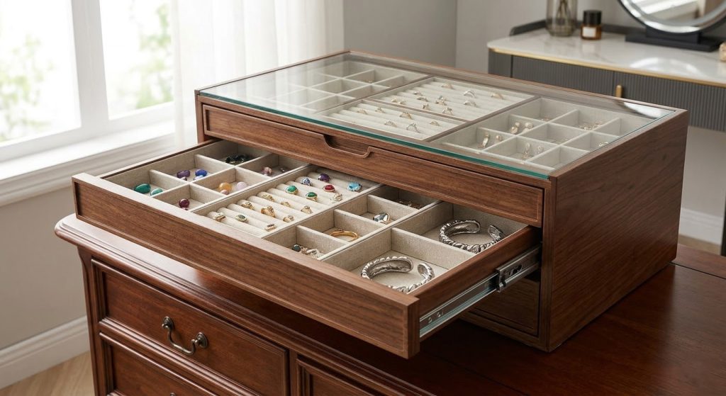 A multi-drawer unit is considered the best jewelry box for avid collectors because it offers high-volume storage with specific sections for diverse accessory types. These larger organizers often feature glass lids that allow you to view your daily essentials while keeping the bulk of your collection shielded from dust.