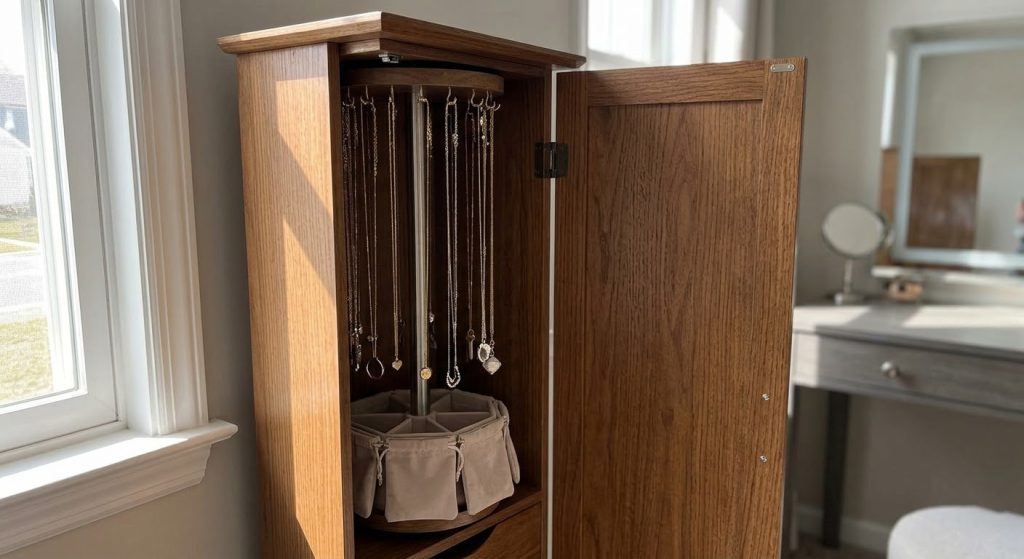 The best jewelry box for necklaces is a vertical cabinet design featuring dedicated rotating hooks that allow chains to hang freely. Using a cabinet-style organizer prevents the clumping effect where different metals can scratch one another or form impossible knots.