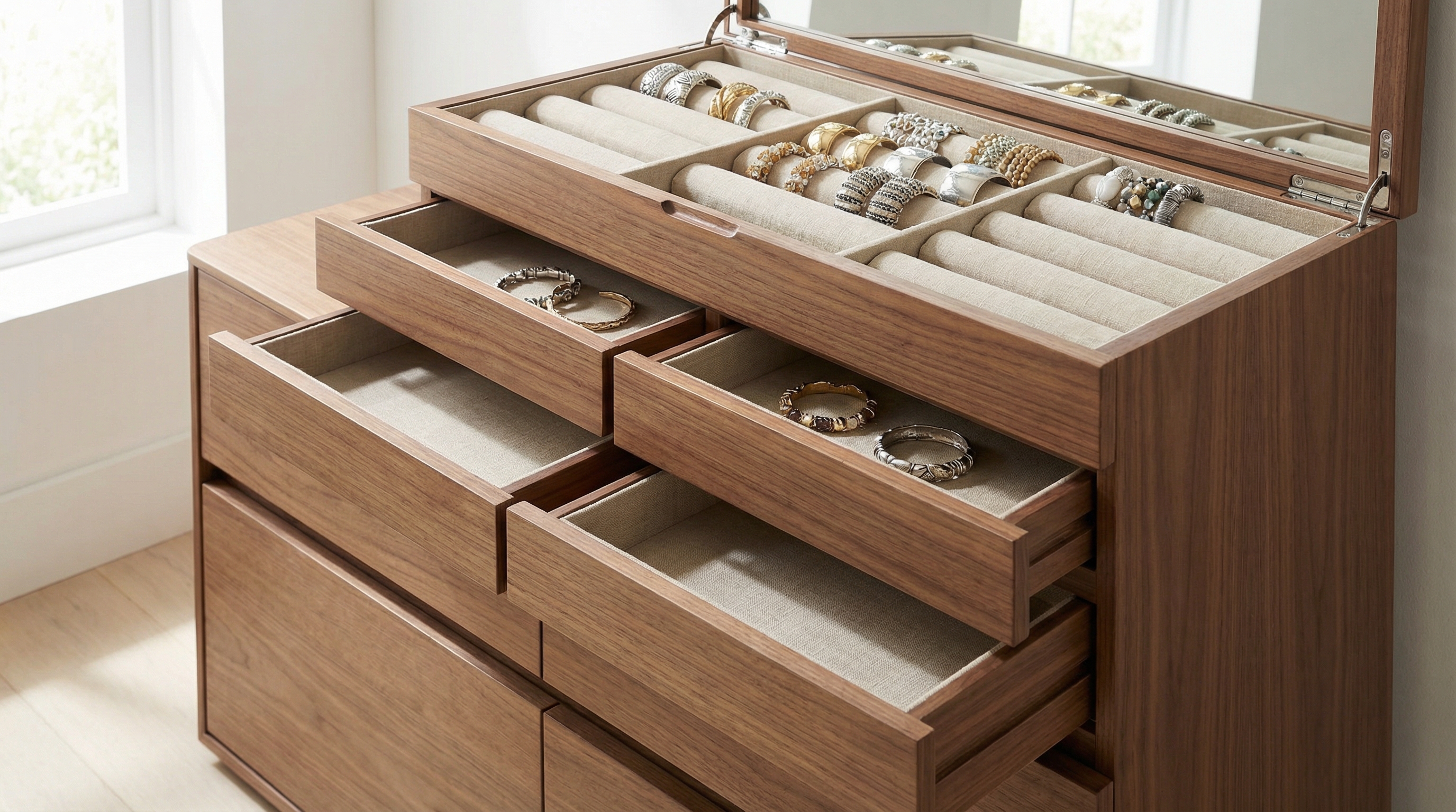 Key Takeaway: Look for modular storage with deep drawers to safely house your largest statement bracelets and watches.