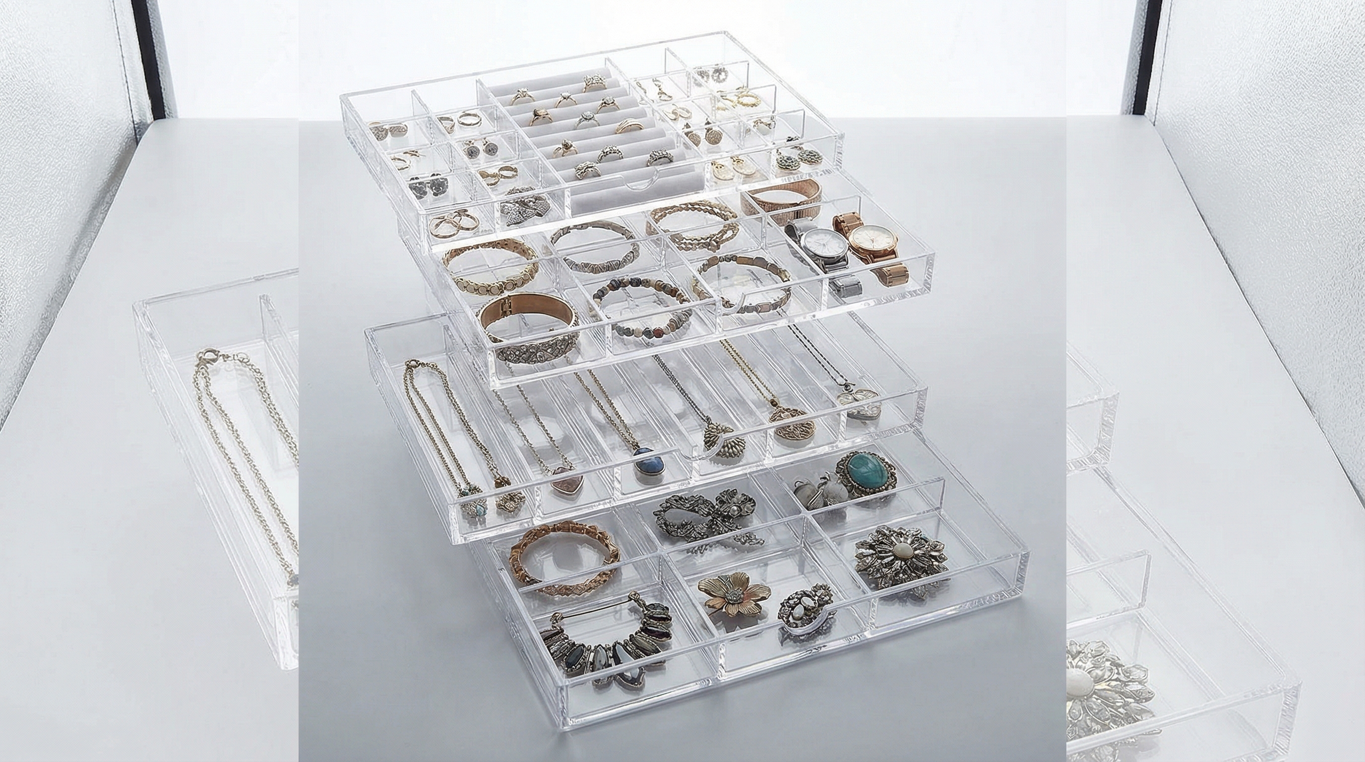 These trays often come with transparent lids or open tops that allow you to see your options at a glance. By stacking, you keep your most-worn items accessible while protecting the pieces underneath from dust.