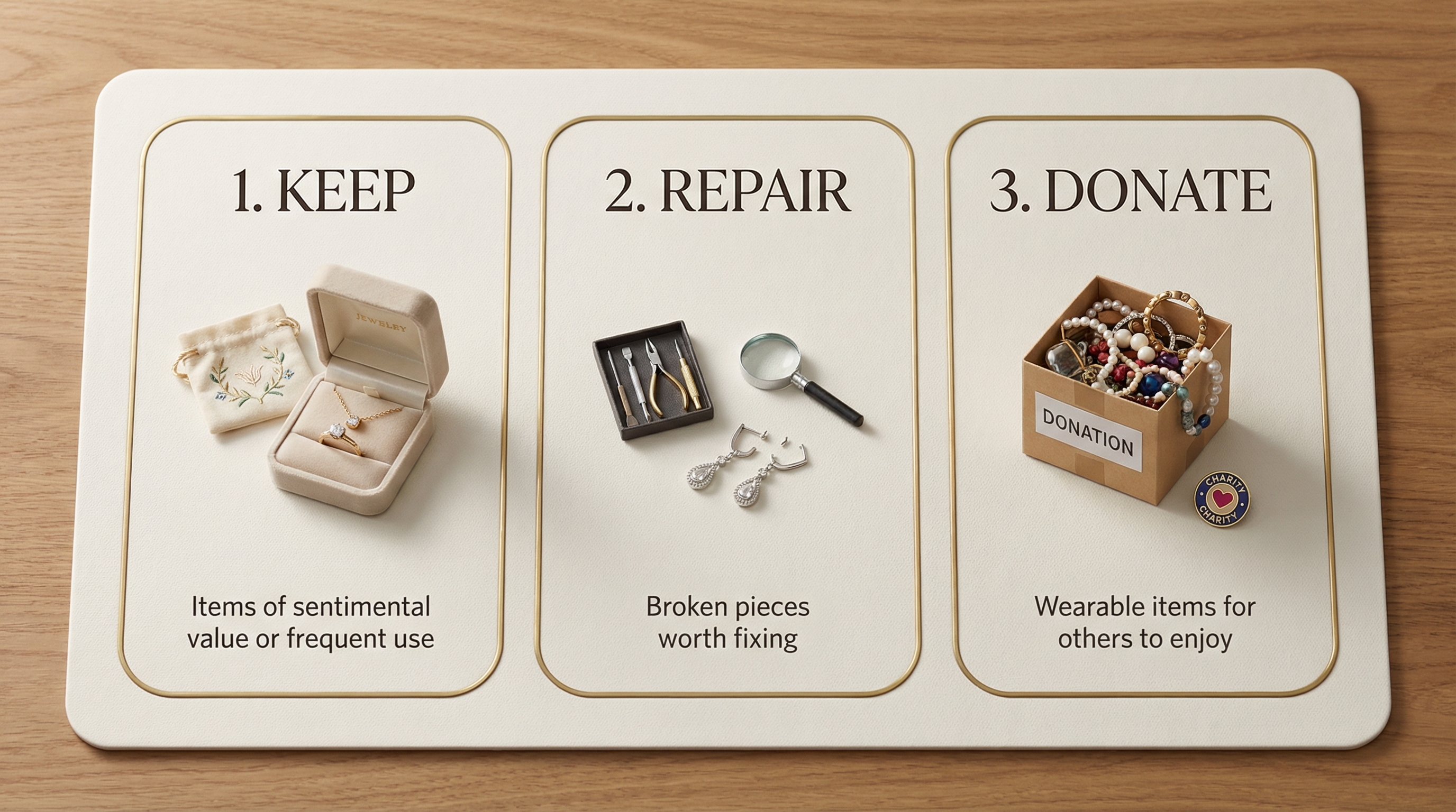 You should categorize your items into three distinct piles: keep, repair, and donate or sell. This process helps you identify which pieces need professional cleaning or a new clasp before they go back into storage.