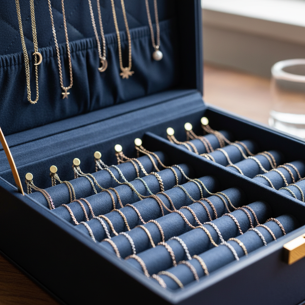 You group items by material or style to streamline your selection process. This answers how do you organize necklaces in a jewelry box? by creating logical zones for rapid outfit matching. Separate gold from silver to prevent chemical cross-contamination and accelerated tarnish.