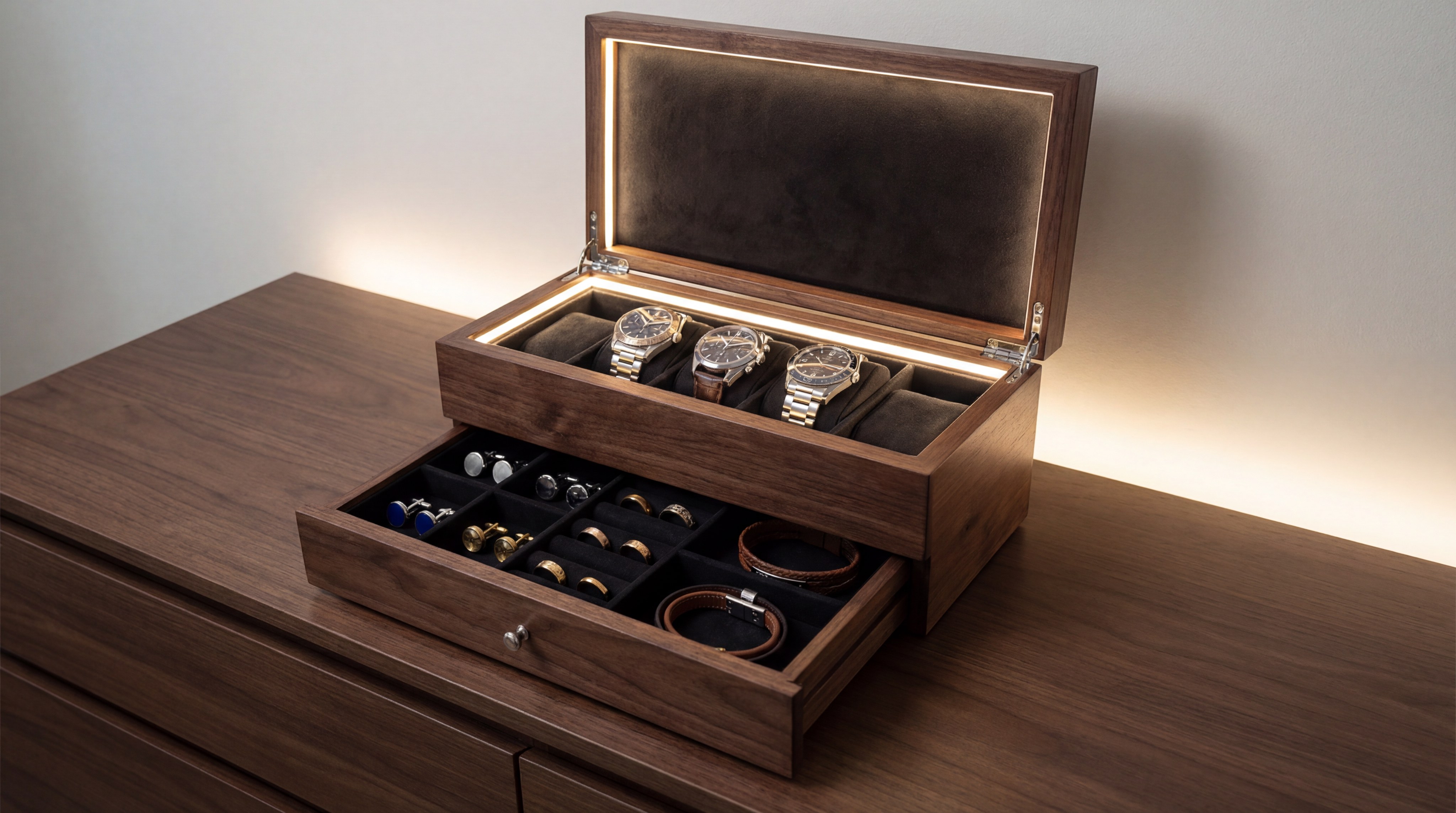 Many modern designs for a custom watch box feature multifunctional tiers that accommodate cufflinks, rings, and other formal accessories. This consolidation ensures that all your professional styling tools are kept in one secure and organized location.