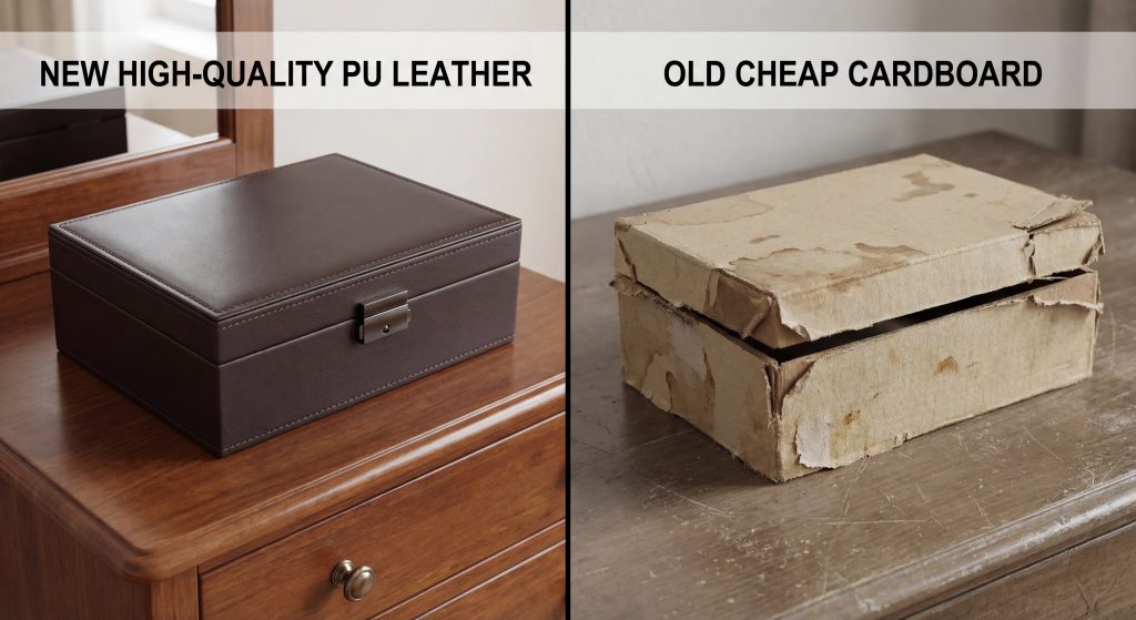 Comparing jewelry box material options reveals that PU leather and solid wood offer the highest resistance to humidity and wear over time. Durability is about resistance to environmental factors like UV light and oils from the skin. You must select materials that can withstand the shipping process and long-term retail display.