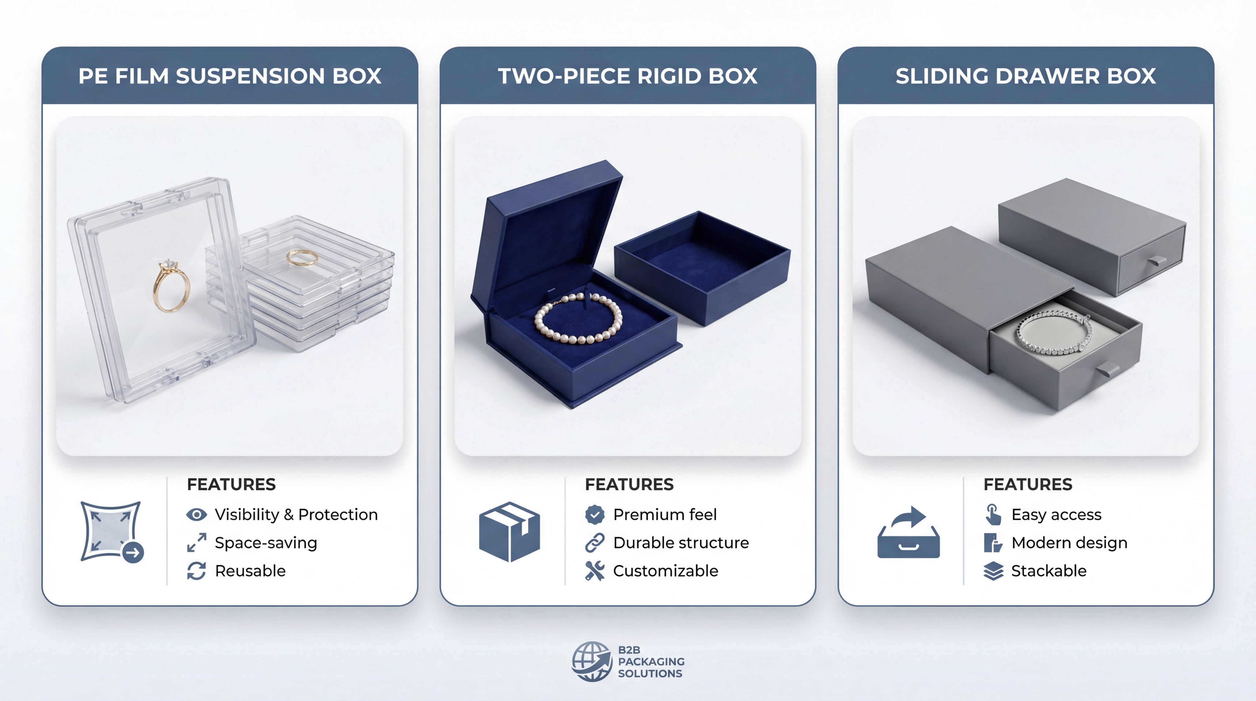 You should consider a mix of suspension boxes, two-piece rigid boxes, and drawer-style containers depending on the specific price point of your jewelry. Determining what packaging is best for jewelry? depends on whether you prioritize display visibility or traditional luxury aesthetics.