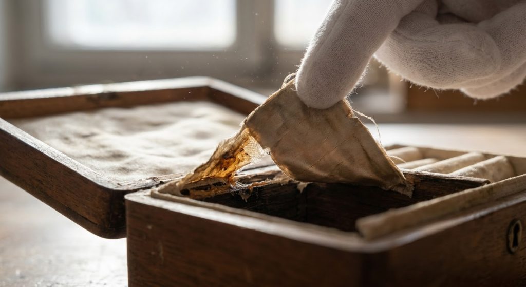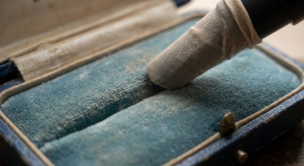 The most delicate part of how to clean antique jewelry box interiors is the fabric, which often holds dust and microscopic mold spores. You must be extremely cautious with liquids here, as velvet and silk can easily watermark or lose their texture. If your internal ring box padding is severely damaged, replacement may be a better long-term solution than intensive cleaning.