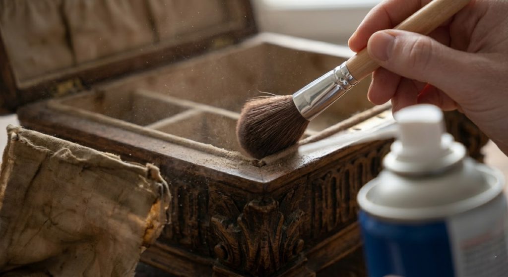 The first step in how to clean antique jewelry box items is removing loose debris that can act as an abrasive during deeper cleaning. Dust particles often contain silica, which can scratch delicate wood or lacquer if you start wiping immediately. You must carefully lift the dust away rather than pushing it further into the grain or fabric fibers.