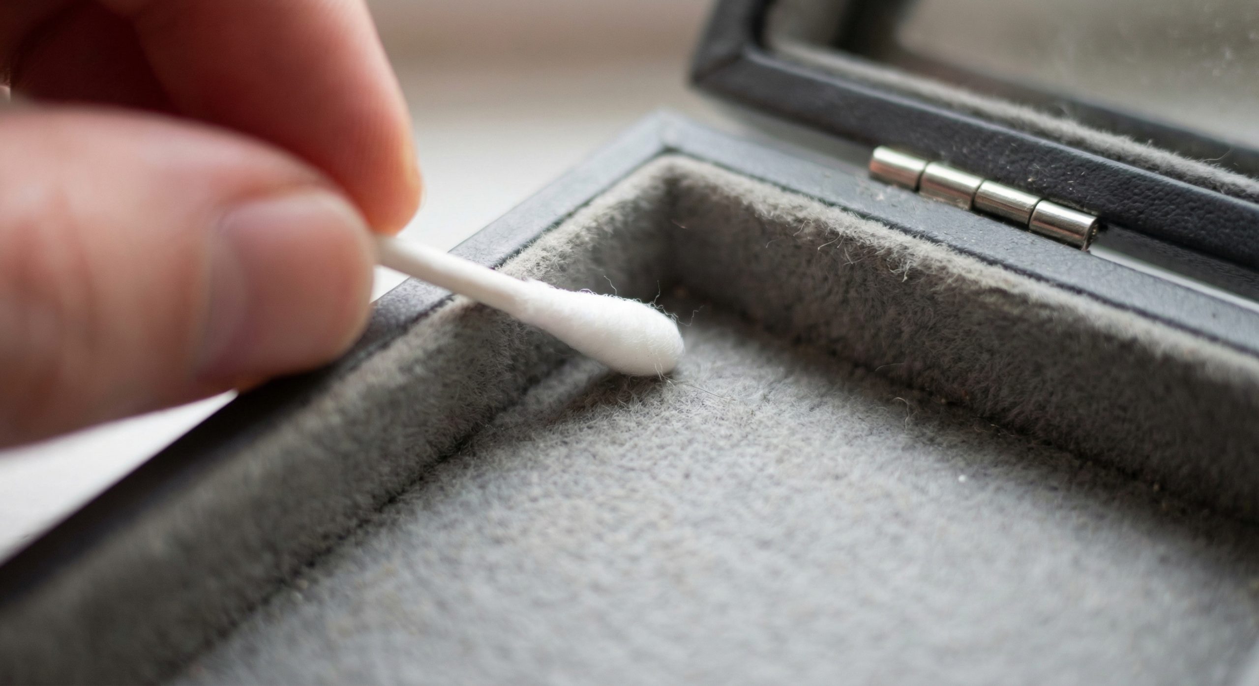 If the color transfers to your testing swab, you must immediately pivot to 100% dry cleaning methods. Attempting a wet clean on non-colorfast felt will result in a ruined box and potentially stained jewelry.