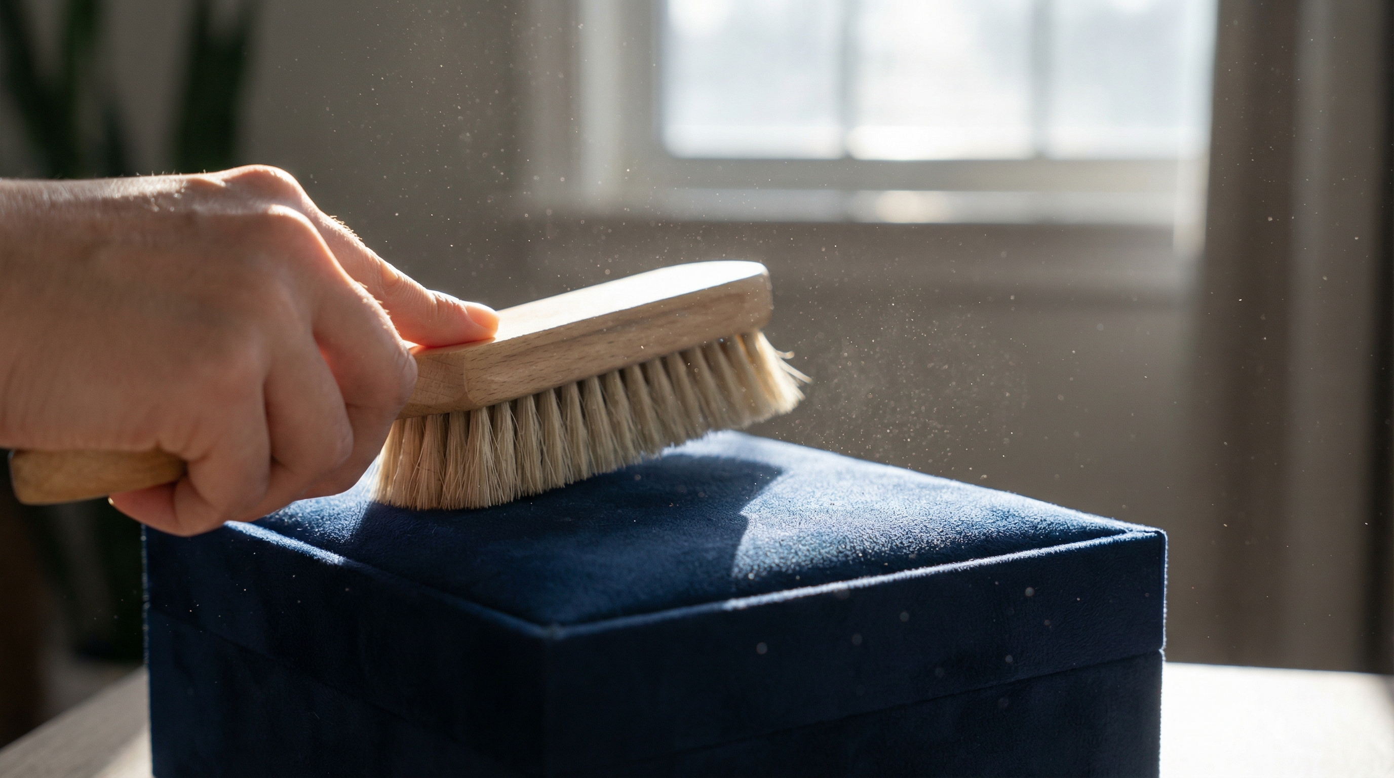 Key Takeaway: Dry dusting with a soft brush or low-suction vacuum is a safe, non-invasive way to maintain the box’s appearance and protect the contents from abrasive debris.
