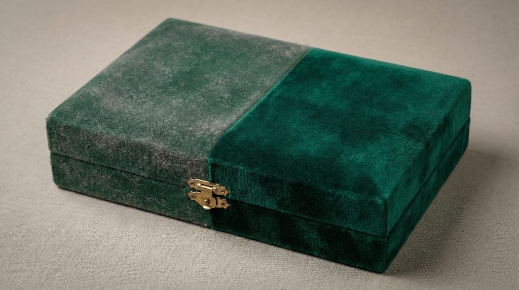 Key Takeaway: Velvet requires a “less is more” approach where dry, gentle techniques are prioritized over wet, aggressive cleaning to protect both the fabric and the jewelry.