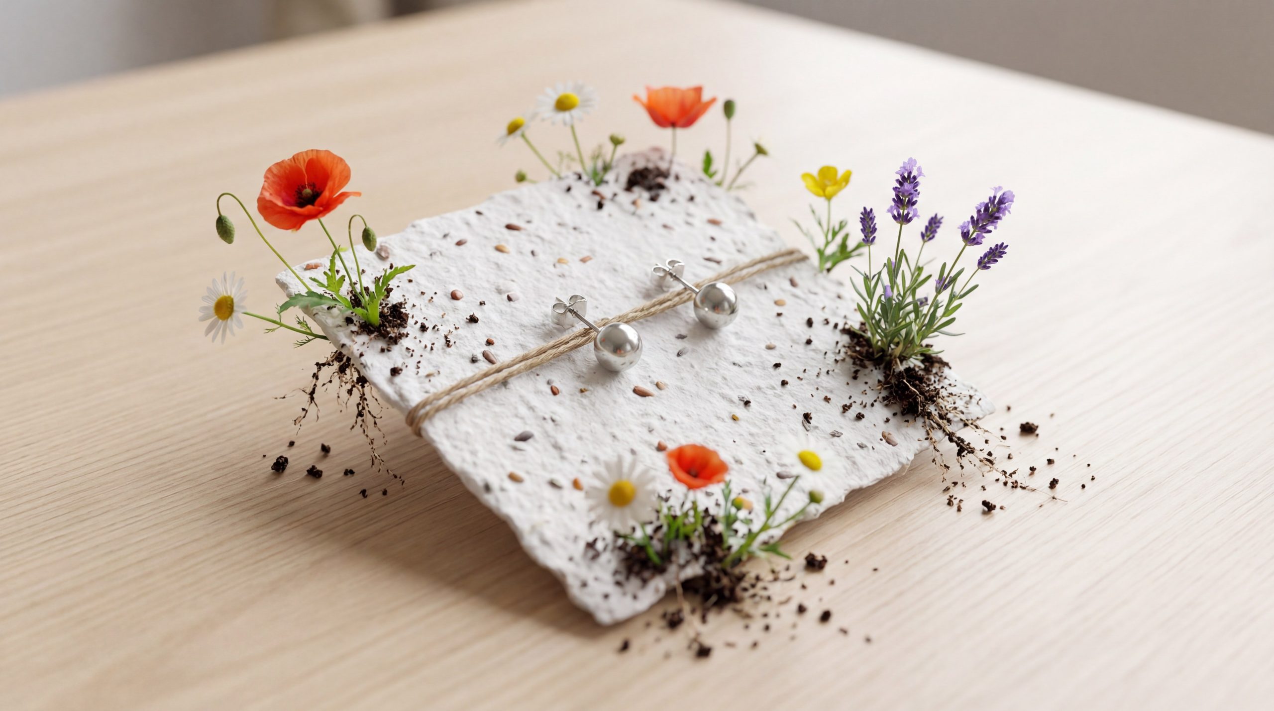 Seed paper aids sustainable earring packaging by turning a piece of waste into a “living gift” that customers can plant to grow wildflowers or herbs. This zero-waste solution ensures that your packaging never sees a landfill. You provide extra value to the purchase, as the packaging itself becomes a secondary product that supports local biodiversity and pollinators.