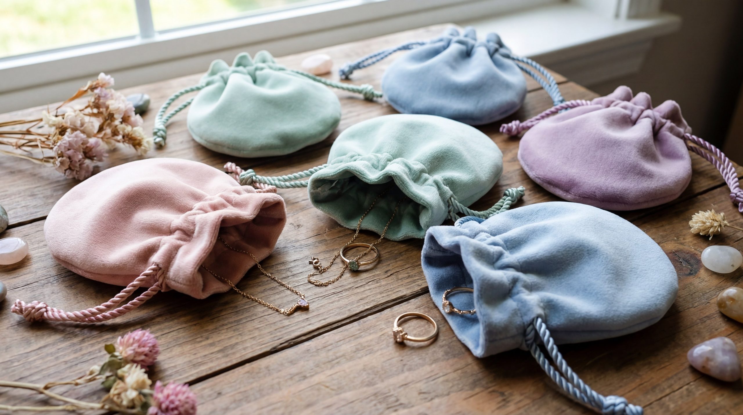 Round pouches offer a soft, organic feel that is easier to store and feels more personal than a rigid box when using cute jewelry packaging . Pouches are incredibly versatile and cost-effective, making them a favorite for small businesses and artisan creators.