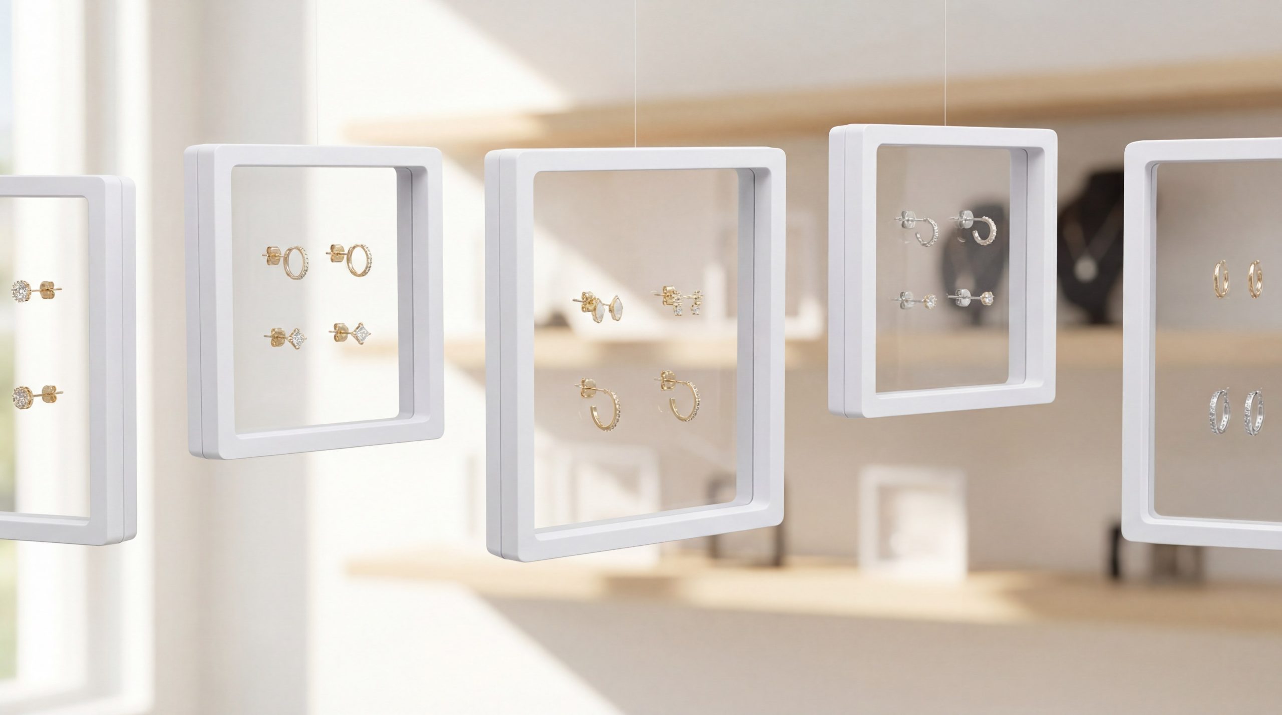 - Angled inserts present rings and earrings toward the viewer.