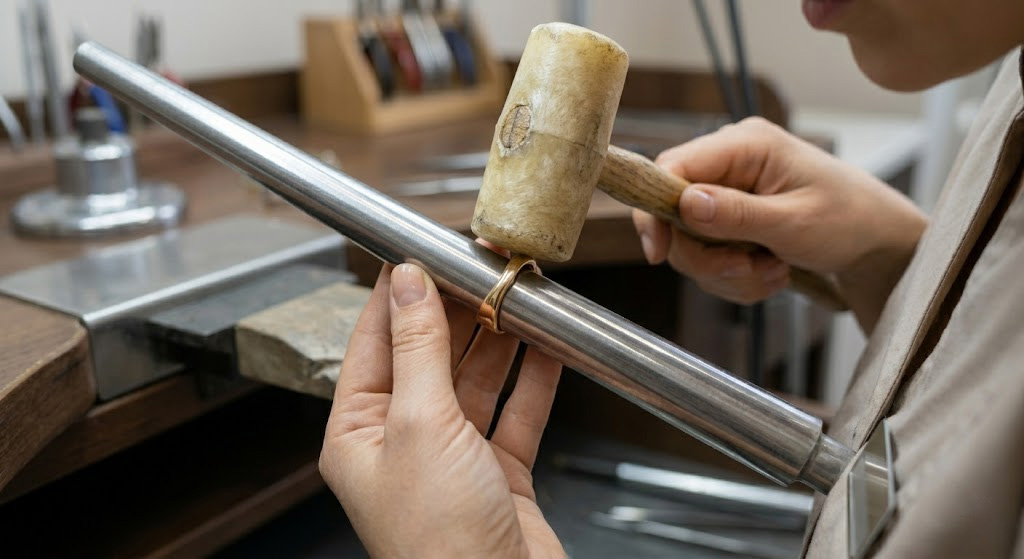 A ring mandrel is your most important tool when correcting a “squashed” or oval-shaped band. You should slide the ring onto the mandrel and tap the high spots to move the metal back into a perfect circle.