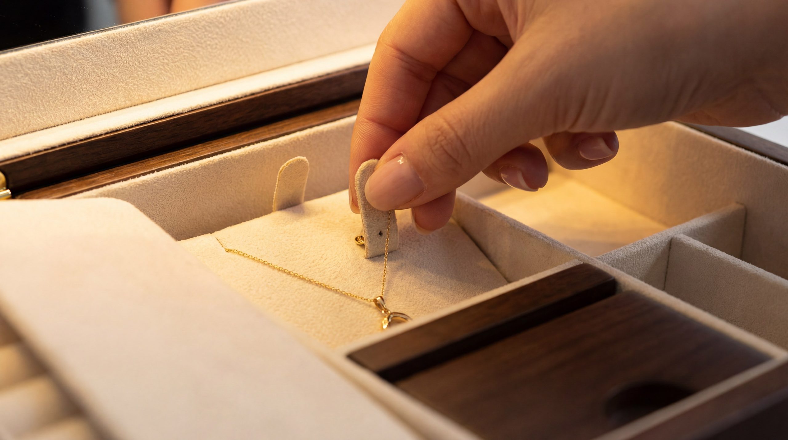 You must use a jewelry pad or a high-density foam insert to anchor the necklaces before closing the lid. For those mastering how to hang necklaces in jewelry box protocols, this final step prevents the chains from swinging during shipping or transport.