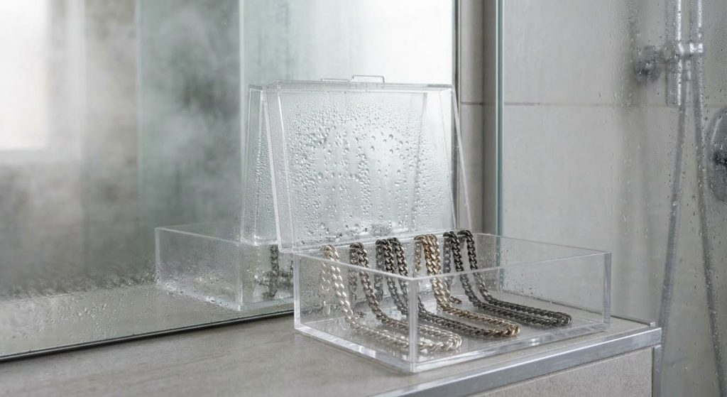 Here is why you should move your jewelry out of the bathroom immediately. The high humidity from showers creates a moist environment that allows oxygen to bond with metal atoms much faster.