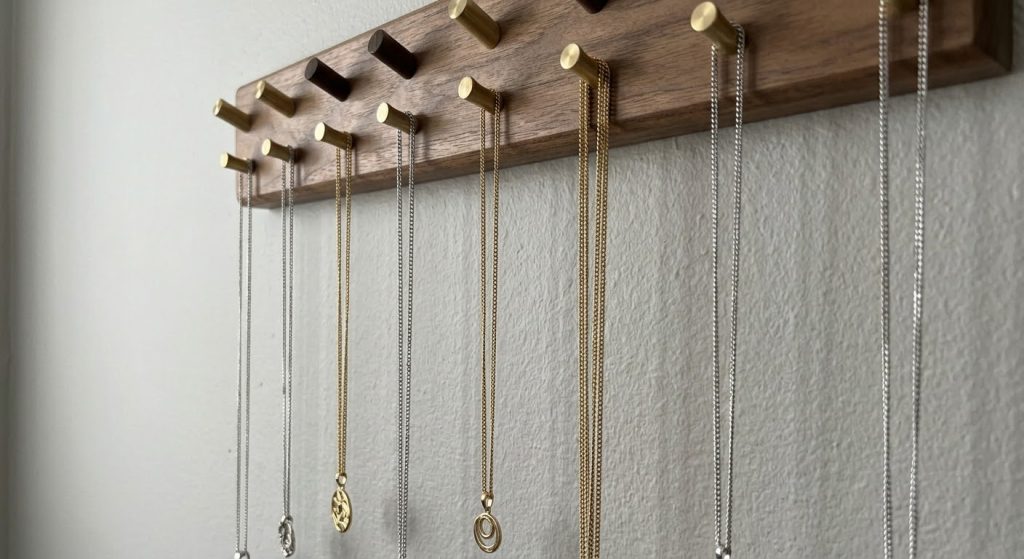 Wall hooks solve the issue by letting gravity keep chains vertical, which makes it physically impossible for a single necklace to knot upon itself. This method is a great visual way to see your entire collection while managing how to keep necklaces from tangling in jewelry box alternatives.