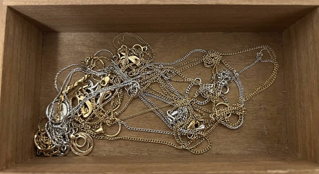 Necklaces tangle because flexible chains naturally overlap and knot when stored in a loose, shared environment without proper tension. Friction between metal links causes them to catch on one another, making it difficult to understand how to keep necklaces from tangling in jewelry box drawers or trays.