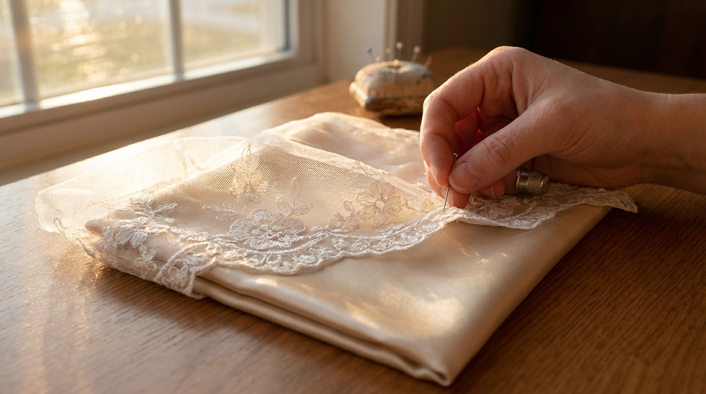 To achieve a professional look, you must treat the lace and the base fabric as a single unit. Pin them together at the corners and along the edges to prevent the delicate mesh from shifting during assembly.
