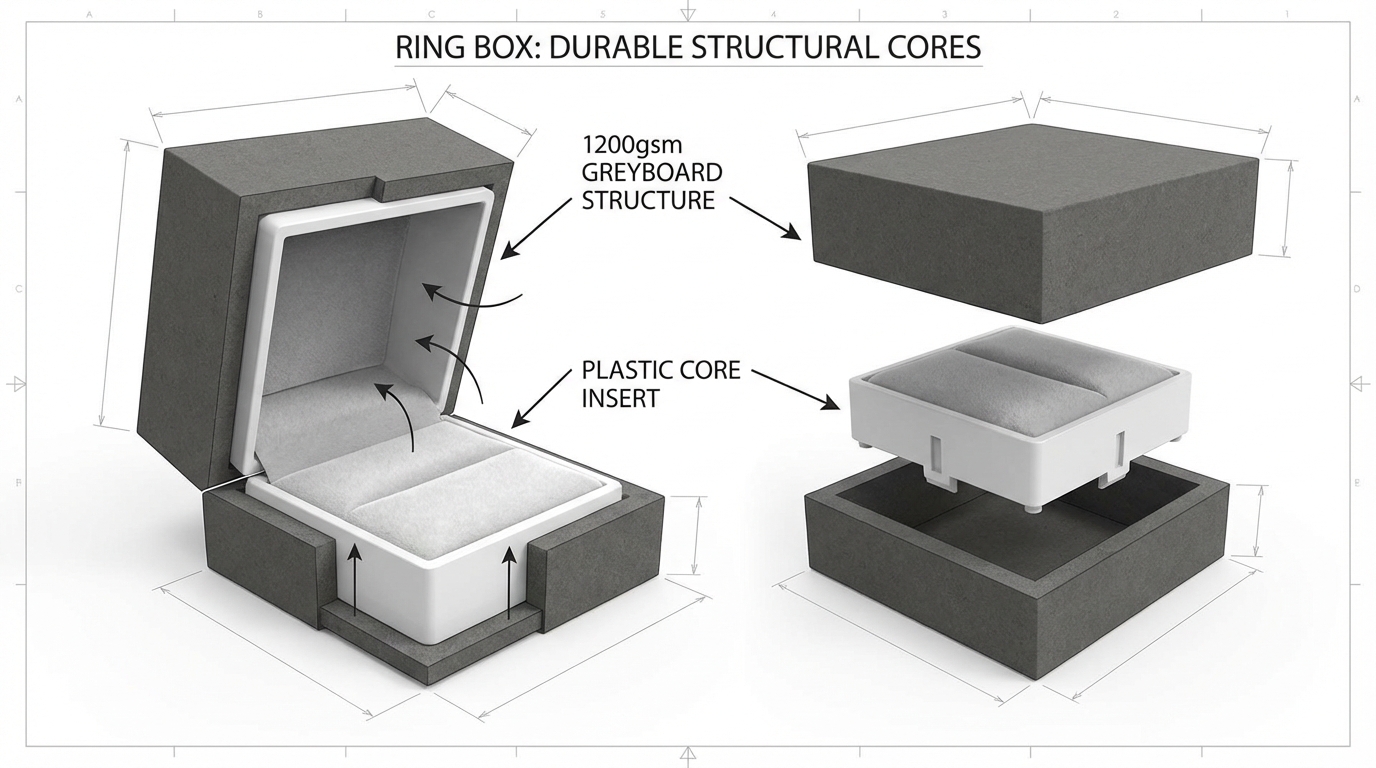 You make a ring box with durable structural cores by utilizing reinforced greyboard or precision-molded plastic to provide the necessary rigidity. These cores act as the skeleton of the packaging, ensuring it maintains its shape under pressure.