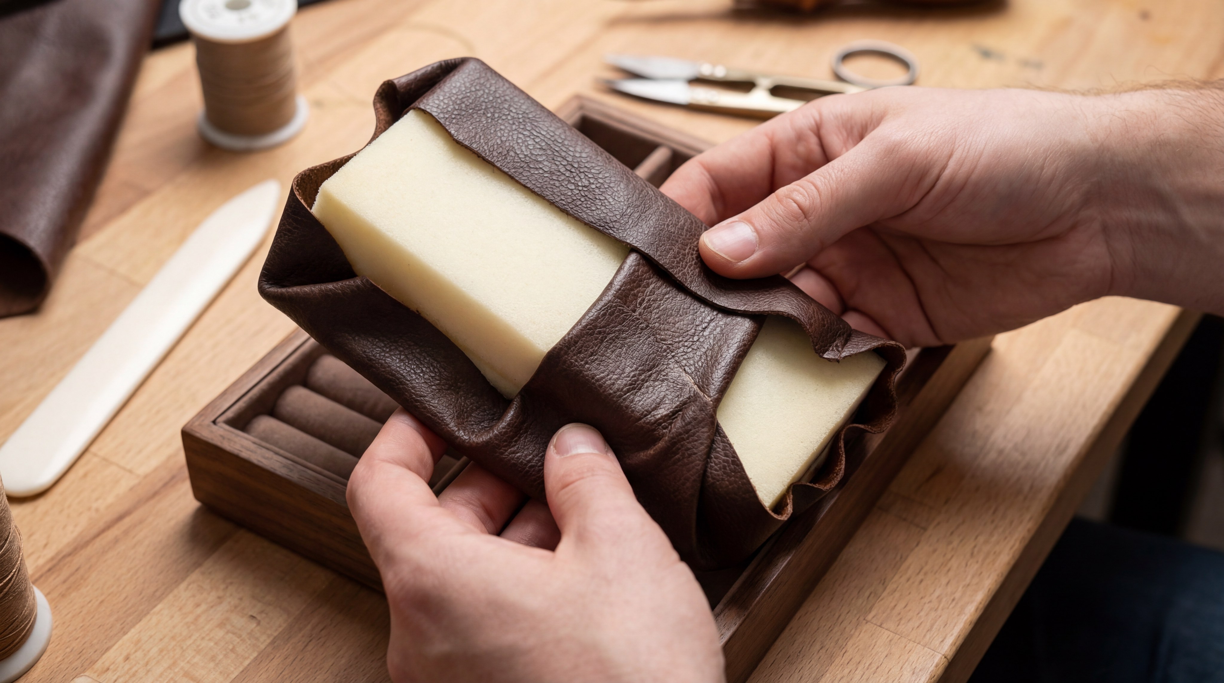 You should cut the foam slightly larger than the cavity to ensure a snug friction fit. Wrap the leather tightly around the foam and secure it with a small amount of adhesive on the underside.
