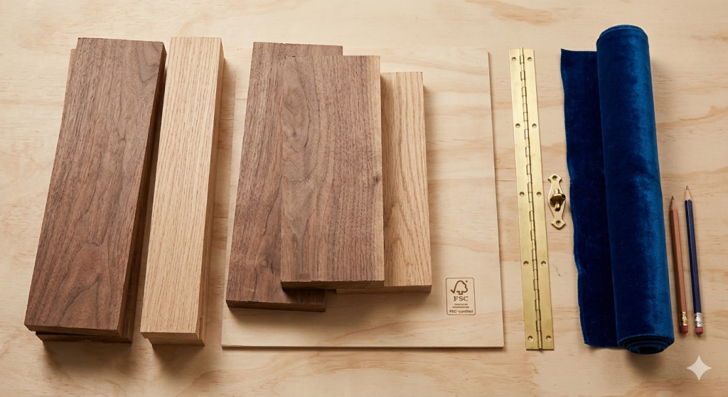 You need six hardwood boards, plywood for the interior, a piano hinge, a box fastener, and velvet fabric. Learning how to make a wooden jewelry box starts with gathering these quality supplies.