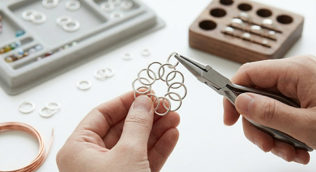 Opening jump rings requires a lateral twisting motion rather than pulling the ends apart, which preserves the ring’s circular shape. This fundamental skill is vital for anyone learning how to make jewelry with professional durability.