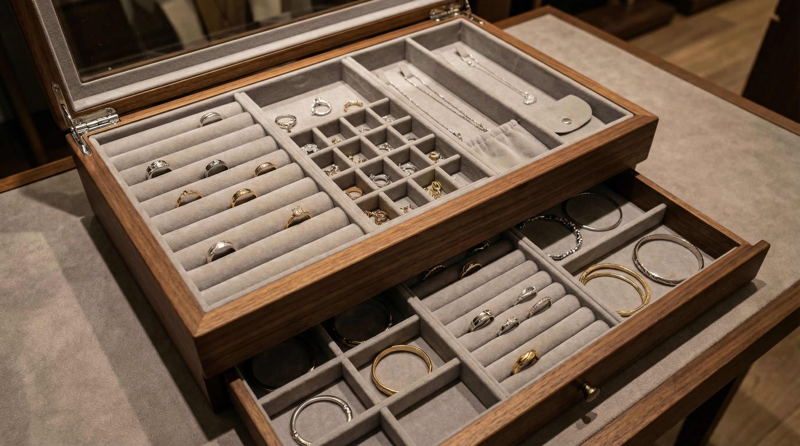 Modular jewelry box inserts are the secret to versatility. By planning removable trays, you allow the user to customize their storage as their collection grows over time.