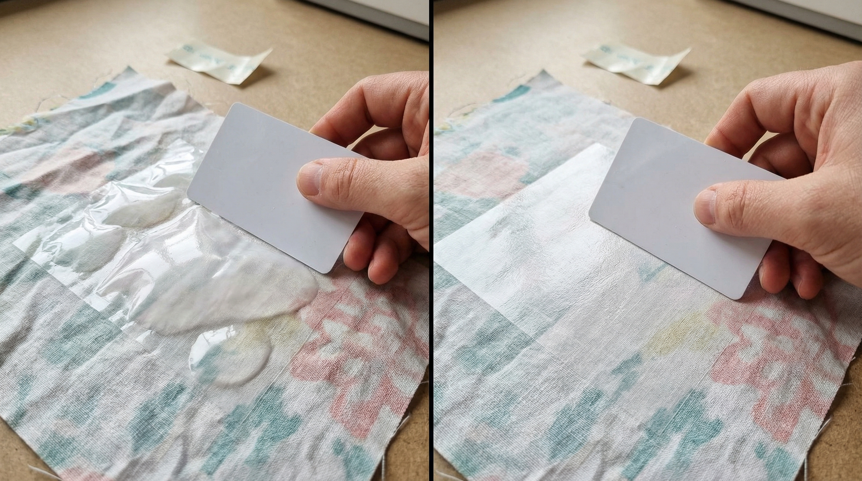 | Smoothing | Flat plastic card | Expel air | |