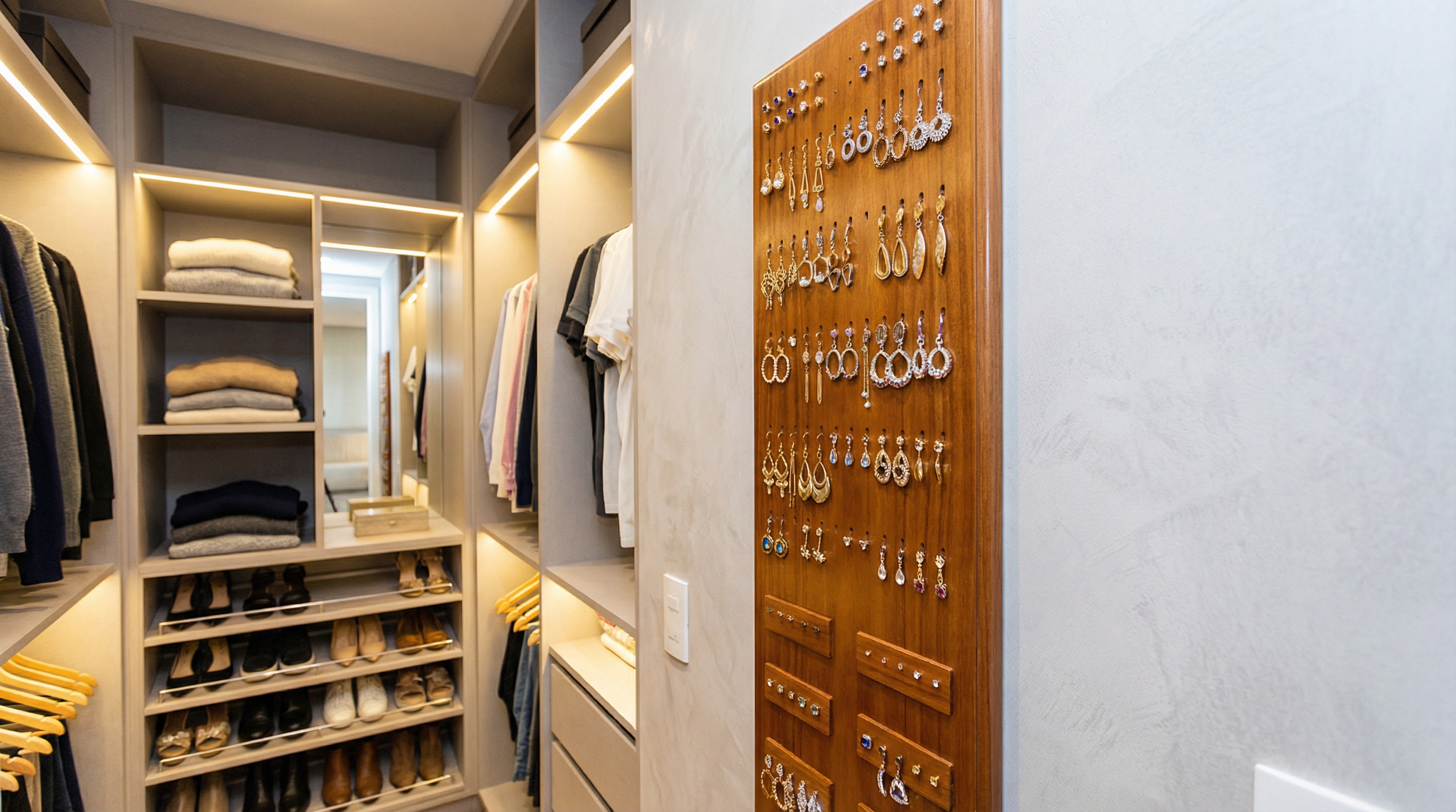 Mounting a wooden rack on a closet wall is an excellent spatial solution for how to organise earrings while keeping them visible. This vertical approach transforms a vacant wall into a functional display area. It allows you to see your entire collection at eye level while choosing your daily outfit.