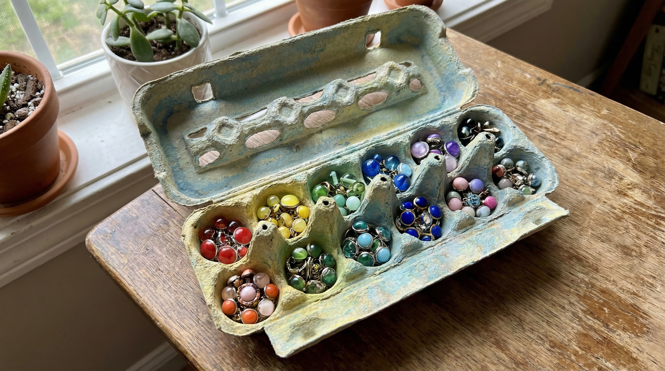 Key Takeaway: Painted egg cartons are a creative, zero-cost way to organize large earrings while supporting sustainable lifestyle choices.