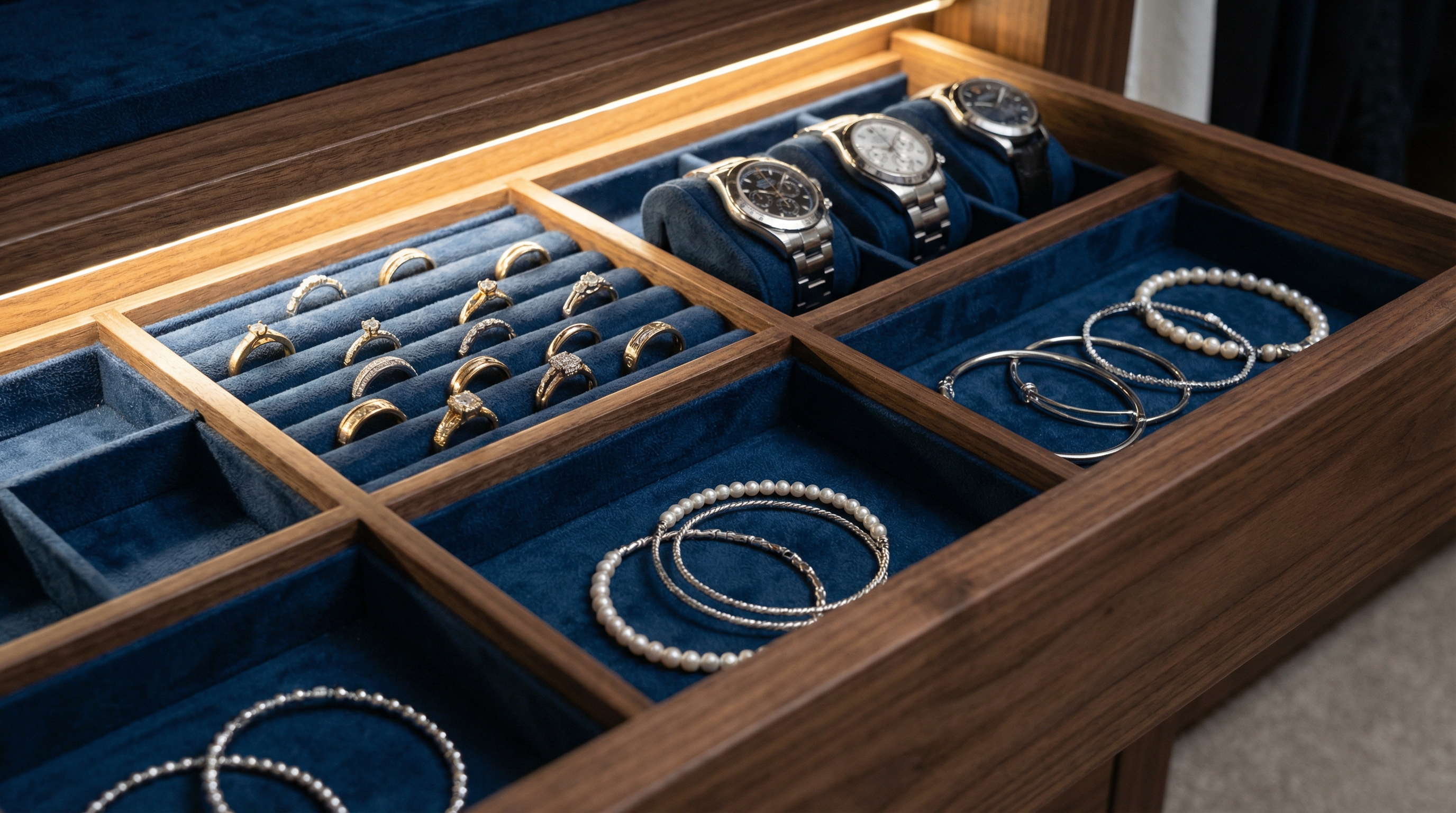 Your daily staples, such as simple studs, wedding bands, or a signature watch, should be accessible within seconds. Placing these in an open top-tray prevents you from having to dig through deeper layers while you are in a rush.