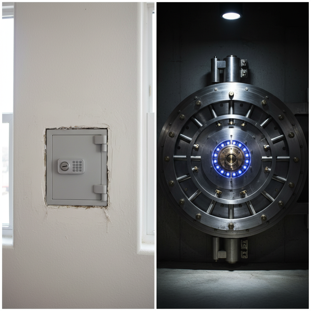 This is where it gets interesting… a typical home safe is rated for only a few minutes of resistance against professional burglary tools. In contrast, a bank vault requires dual-key authentication and is surrounded by reinforced concrete and steel that provides hours of resistance.