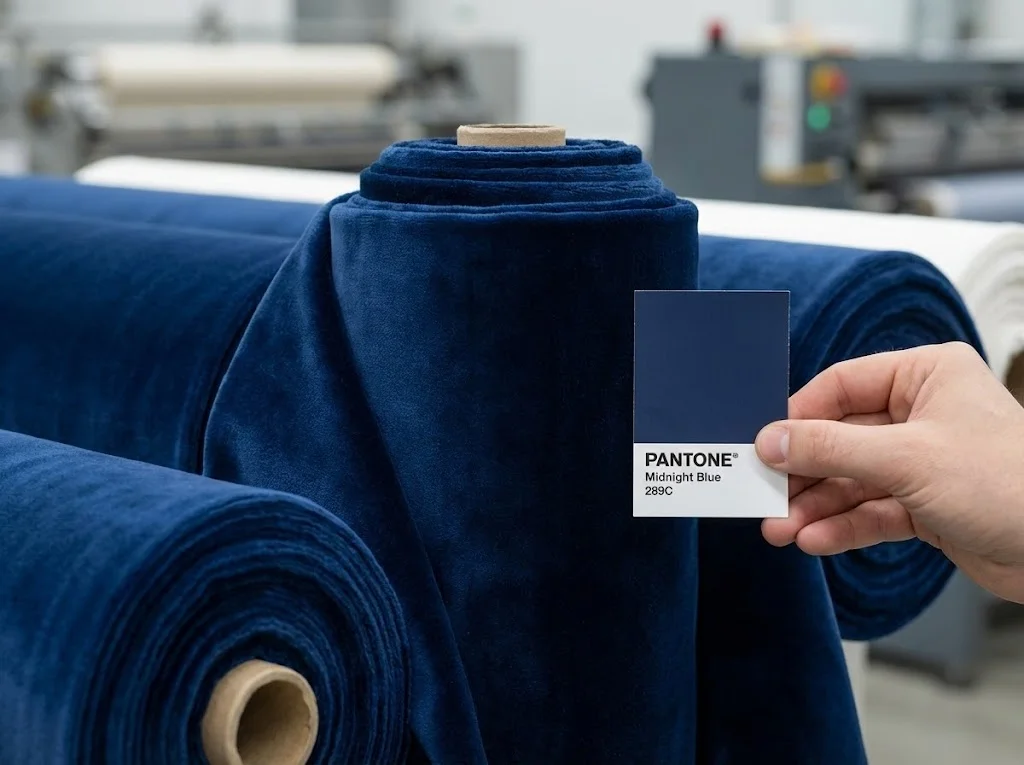 Standard market fabrics failed. We sourced raw velvet and custom-dyed it to match Lumina's Pantone 289C perfectly, ensuring consistent brand presentation