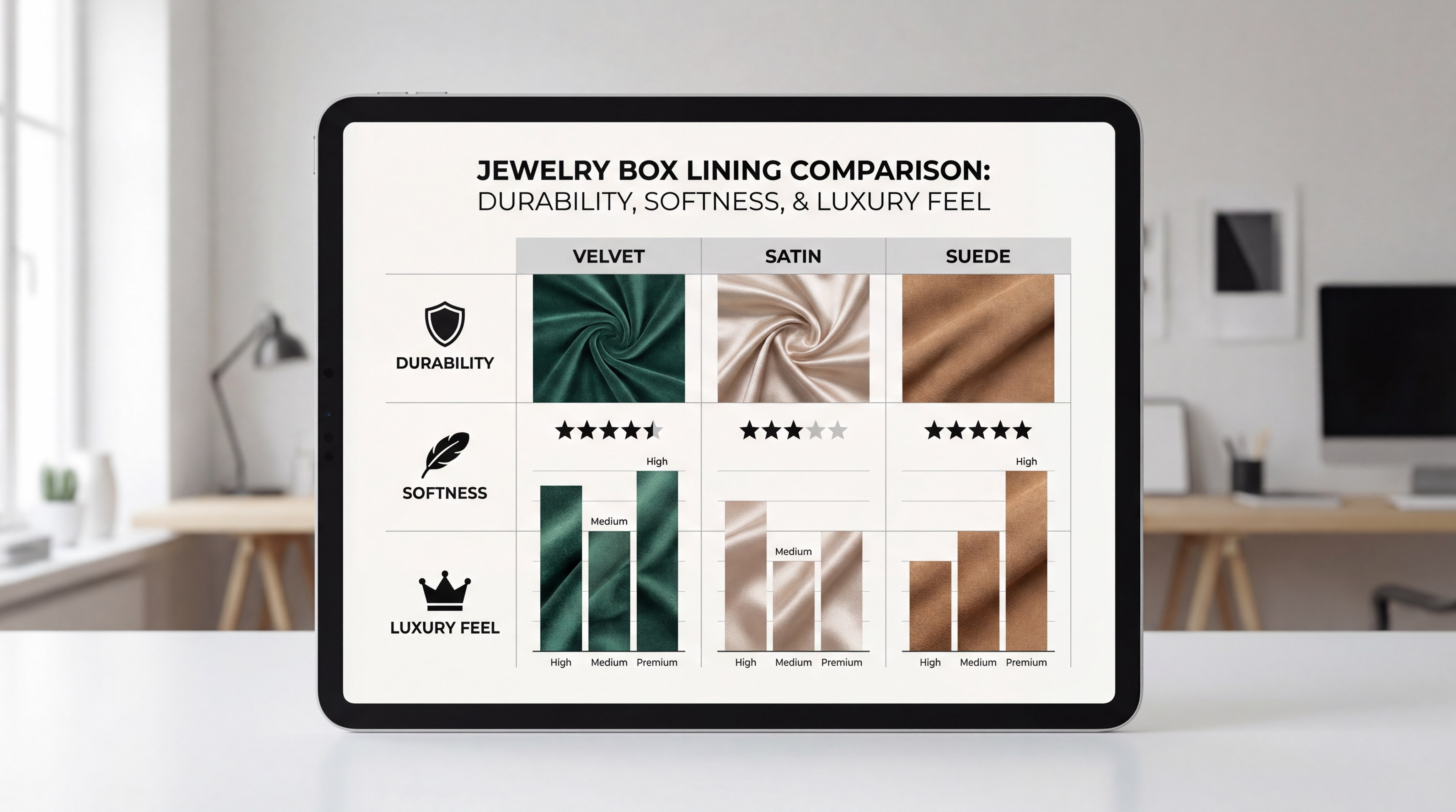 The fabric you choose as an interior jewelry box material is what actually touches your product. It must be soft enough to prevent scratches while being chemically stable enough to prevent tarnish. You should select textiles that contrast with the jewelry to make the colors “pop” upon opening.