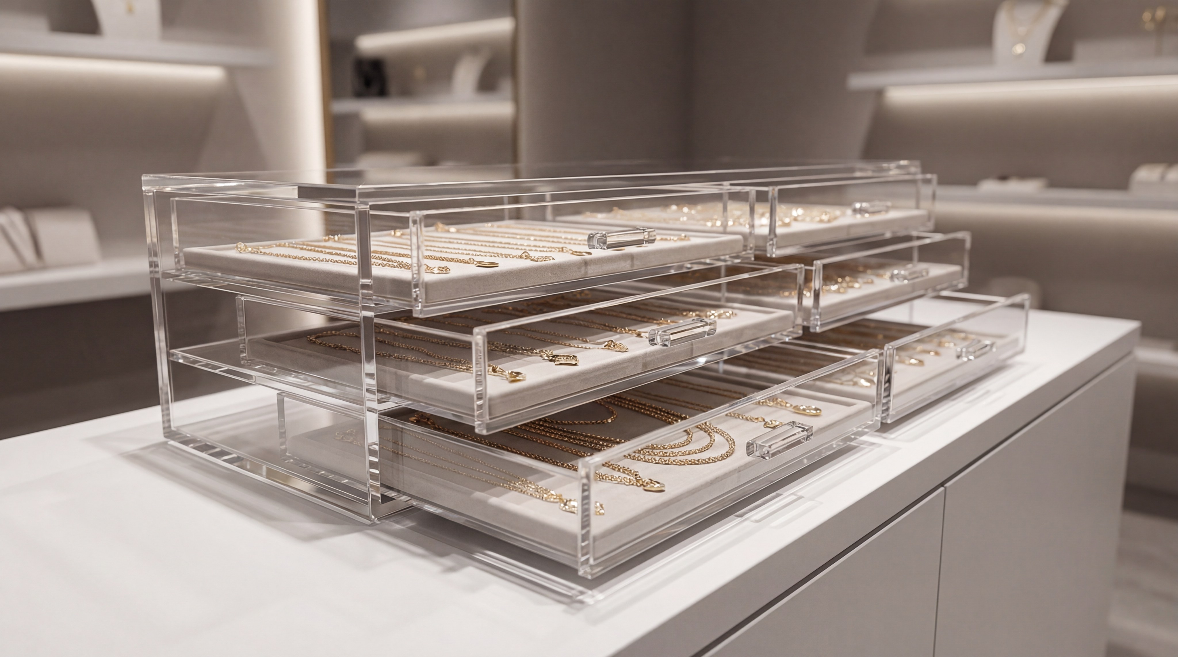 Acrylic is a revolutionary jewelry box material that prioritizes visibility and display-ready aesthetics. It allows you to showcase the product while it is still inside the protective casing. This transparency is particularly useful for retail environments where you want the customer to see the brilliance of a stone immediately.