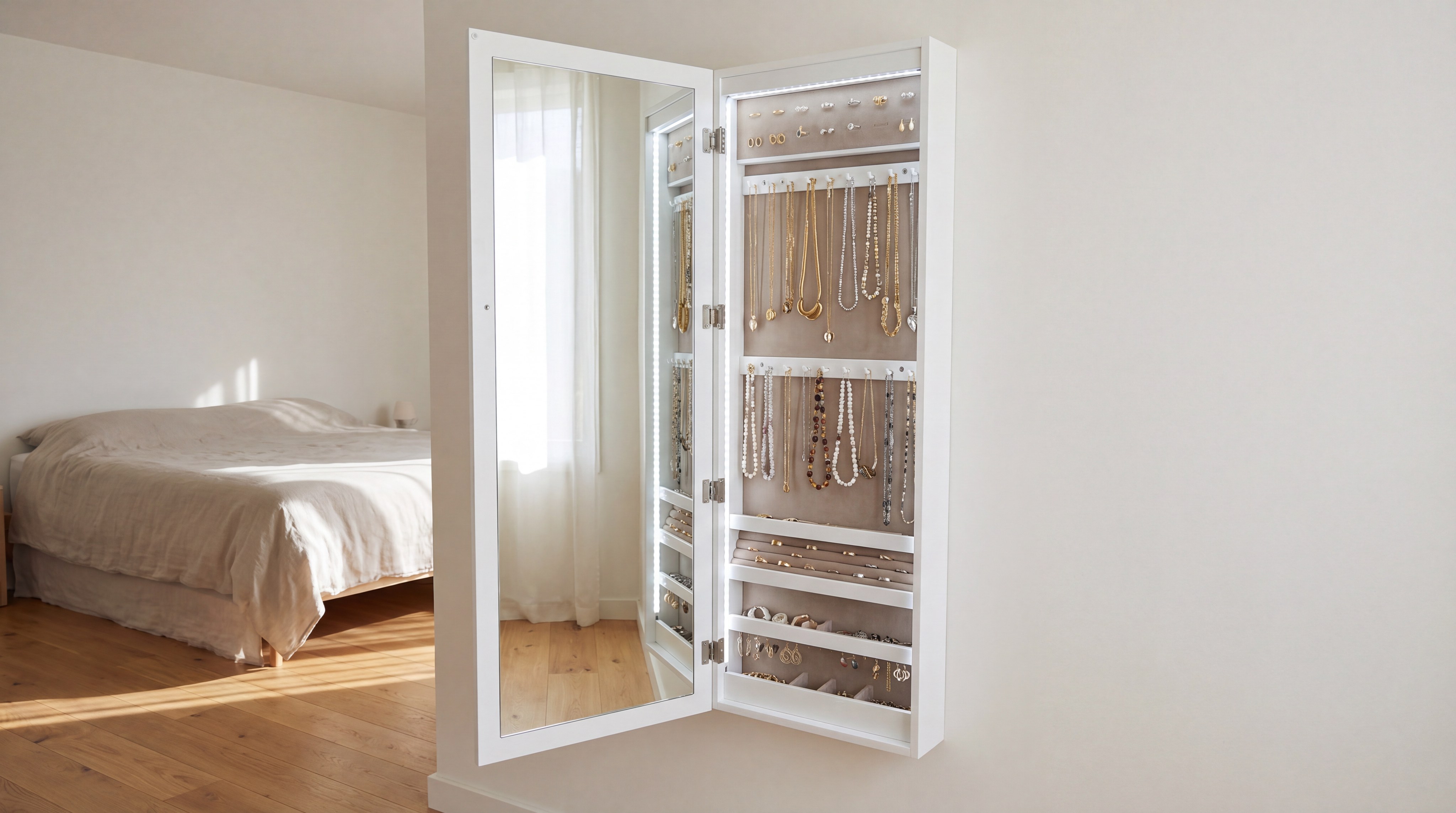 A wall-mounted armoire is right for you if you have a large collection but limited floor or dresser space. These units utilize vertical wall real estate to organize hundreds of items without cluttering your room. They are particularly effective for keeping earring box collections and long necklaces visible and tangle-free at eye level.
