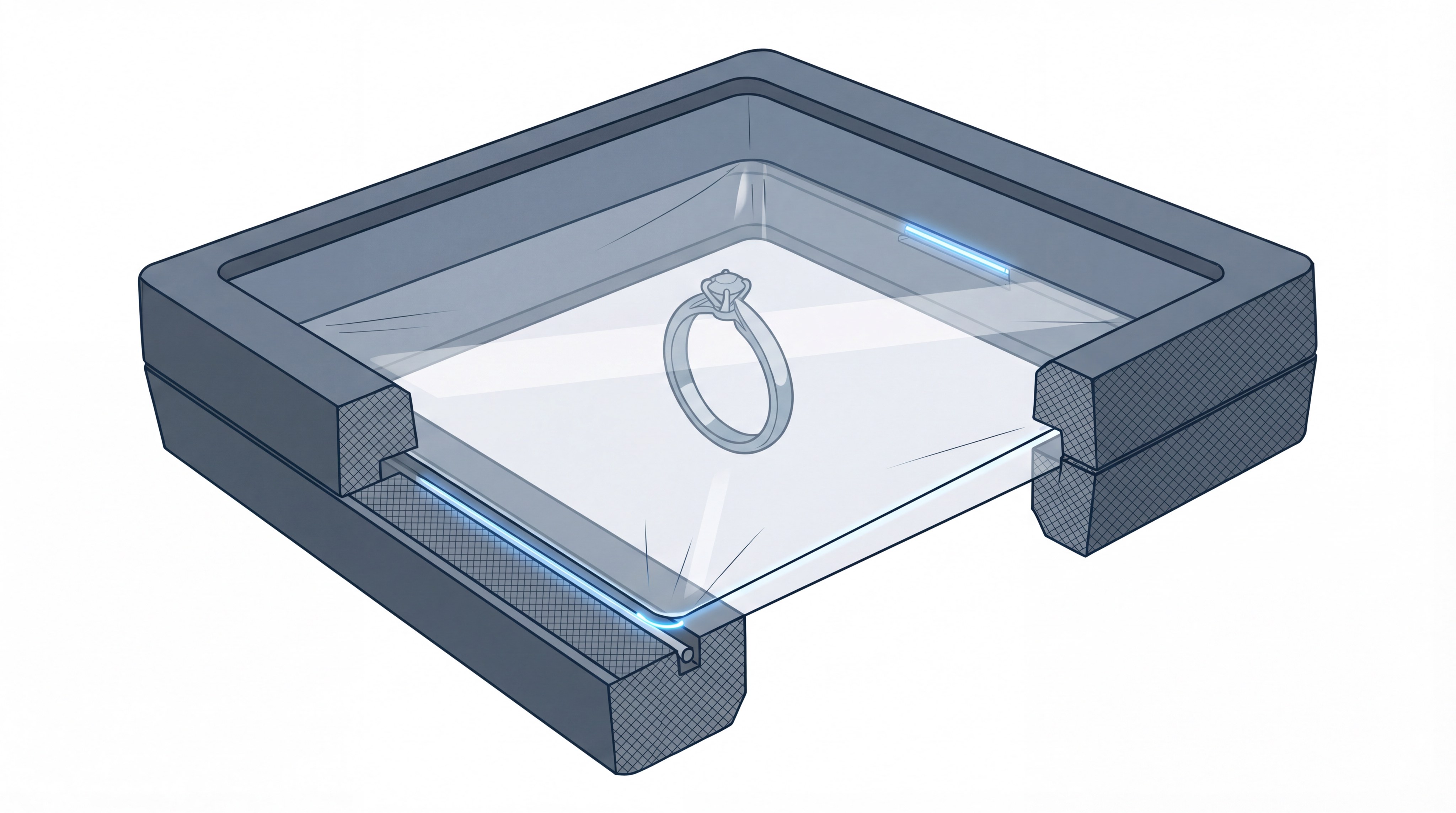 Lighting is the secret weapon of high-end jewelry presentation. Integrated LED bulbs are designed to hit the crown of a diamond at the perfect angle to maximize fire and brilliance.