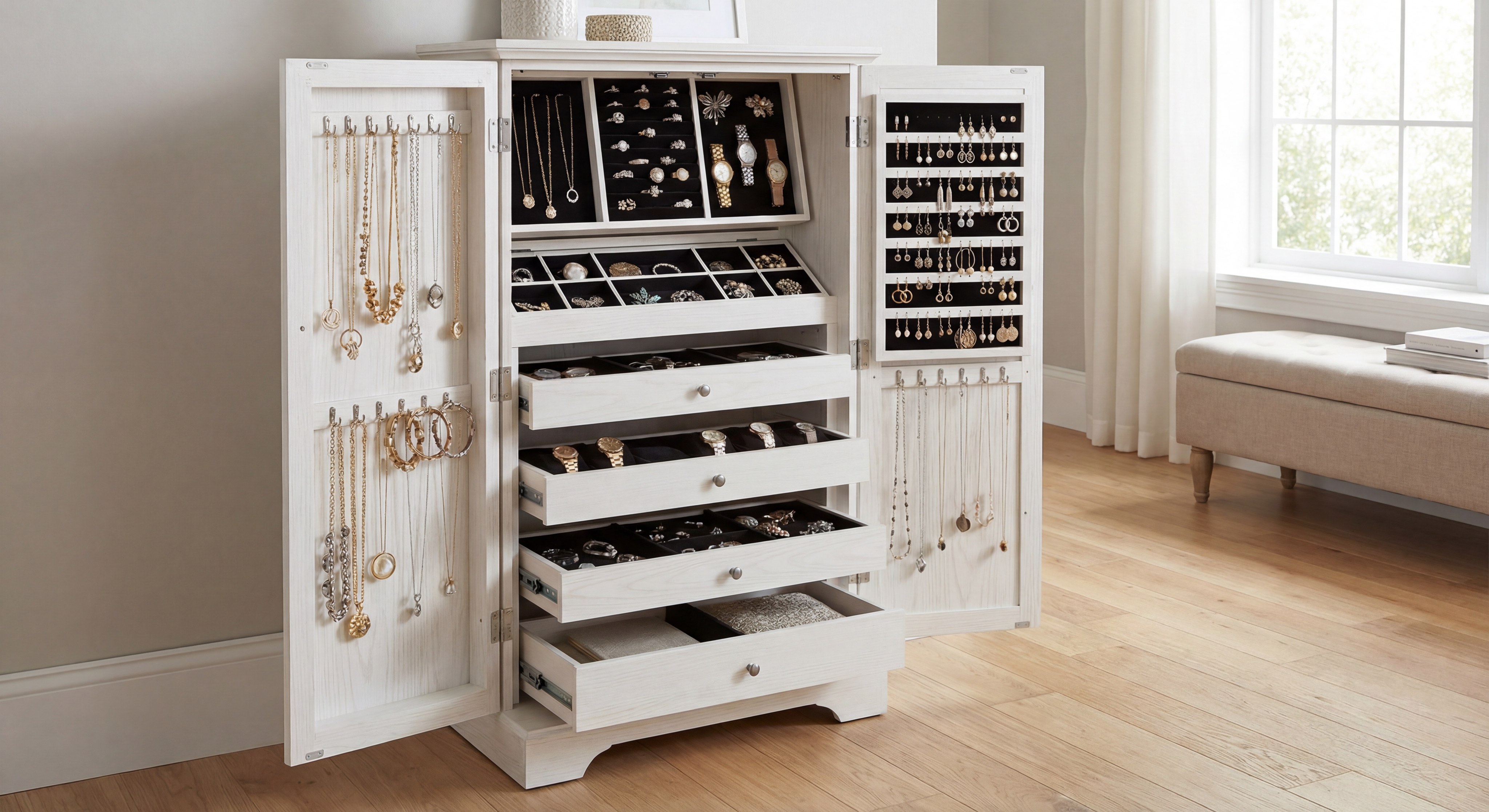 - Massive Capacity: Multiple drawers and side wings accommodate everything from rings to long necklaces.
