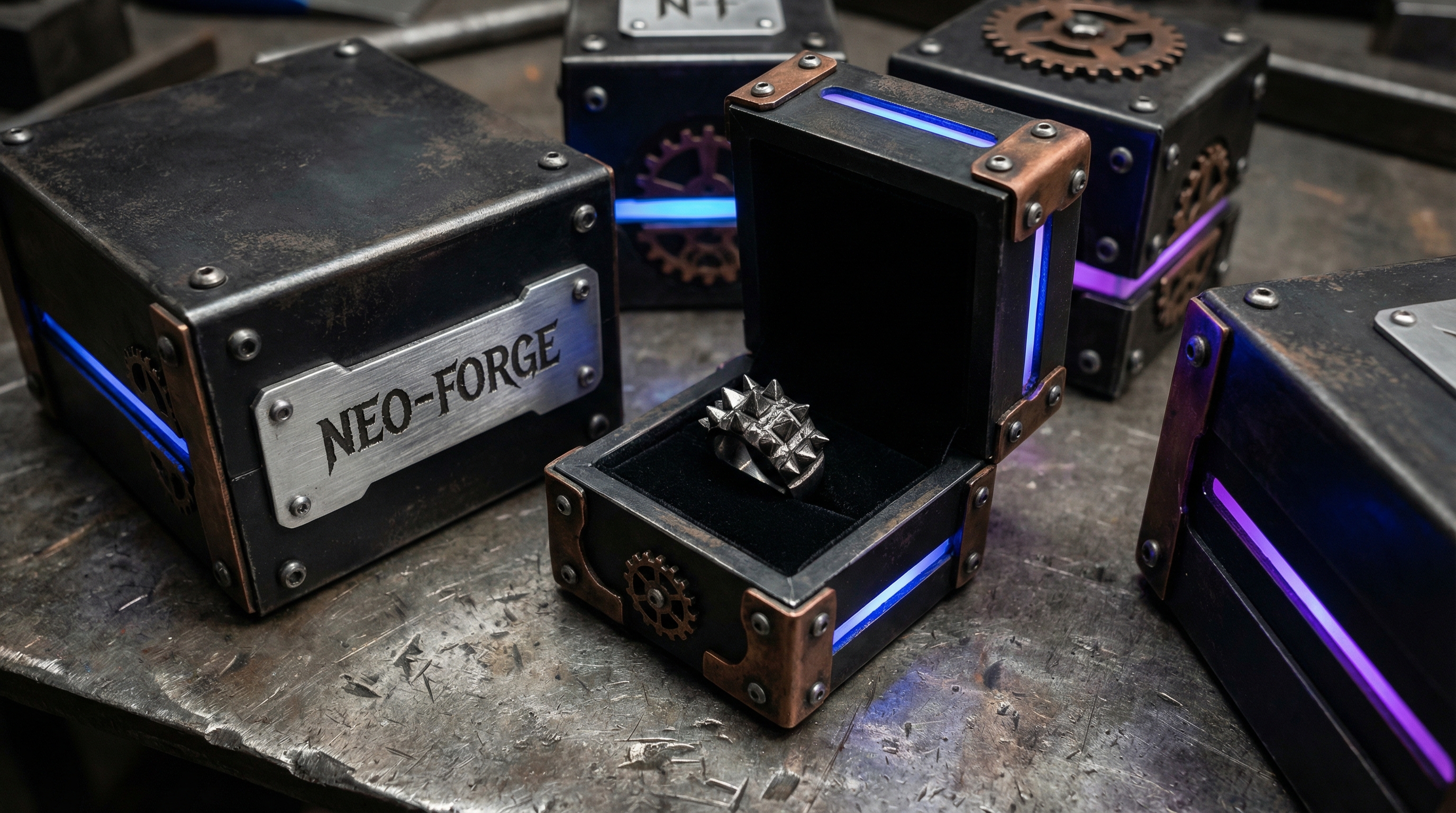 Edgy Neopunk jewelry packaging ideas utilize dark palettes, industrial textures, and metallic hardware to appeal to a bold, alternative market. This aesthetic breaks away from traditional “soft” luxury, offering a gritty, high-fashion alternative that stands out in a sea of velvet and ribbon. It is particularly effective for men’s jewelry or gender-neutral avant-garde collections.