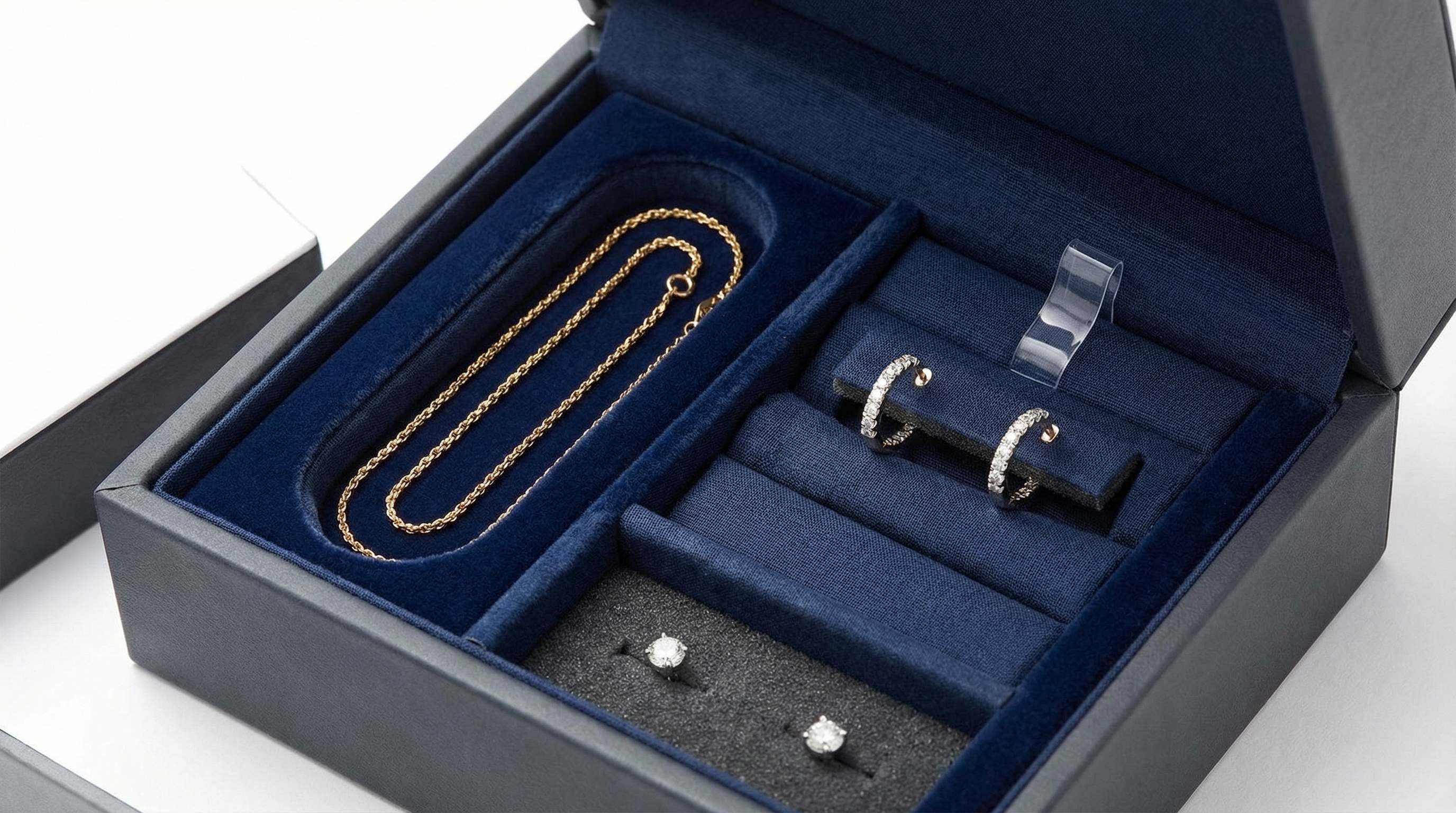 Properly designed inserts act as shock absorbers during the shipping process, preventing delicate prongs from bending and stones from loosening. They also ensure that when the box is opened, the jewelry is perfectly centered and facing the customer.