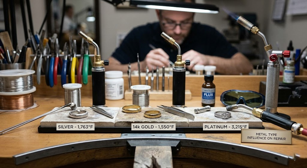 Metal type dictates cost due to varying melting points, specialized equipment needs, and the market value of the raw material. Your jewelry repair cost will fluctuate wildly between a silver ring and a platinum one. Platinum, for instance, requires a dedicated set of tools and high-temperature torches that gold does not.