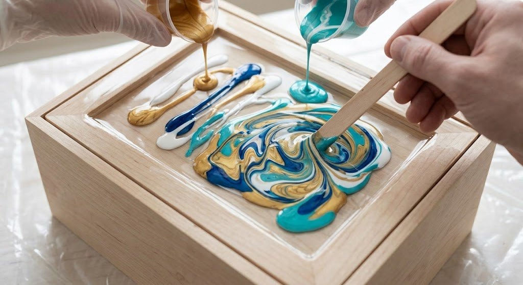 The artistic highlight of how to make a homemade jewelry box is the moment you pour and swirl your colors. You start by flooding the recessed lid with clear resin and then drizzling your tinted portions randomly across the surface. This technique allows the colors to suspend and move organically, mimicking the look of expensive natural stone.