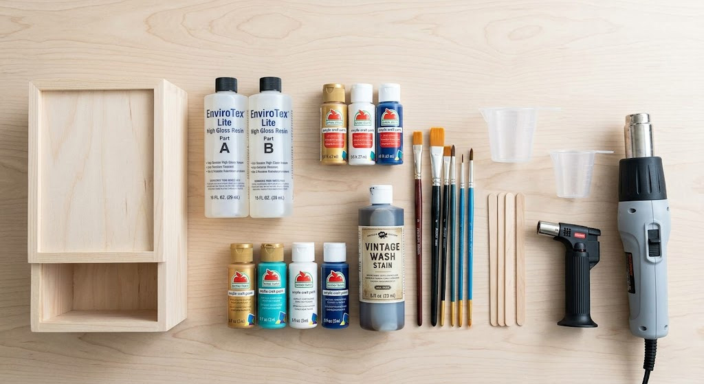 Gathering the right materials for  how to make a homemade jewelry box  ensures you do not have to stop mid-process. You will need unfinished wood, resin, various paints, and high-quality brushes to achieve a professional look. Having these on hand allows for a seamless transition between the painting and pouring stages.