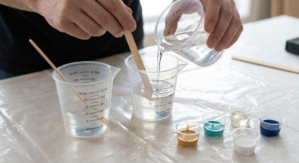 Key Takeaway: Slow and steady stirring prevents the introduction of excessive air bubbles into the chemical mixture. Always keep some resin clear to act as the base for your colorful drizzles and swirls.