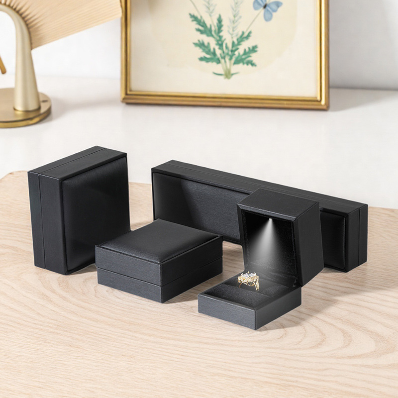 LED ring boxes are available in multiple velvet colors and can be personalized with engraving. The lighting system is carefully designed to highlight diamond brilliance without overwhelming the presentation.