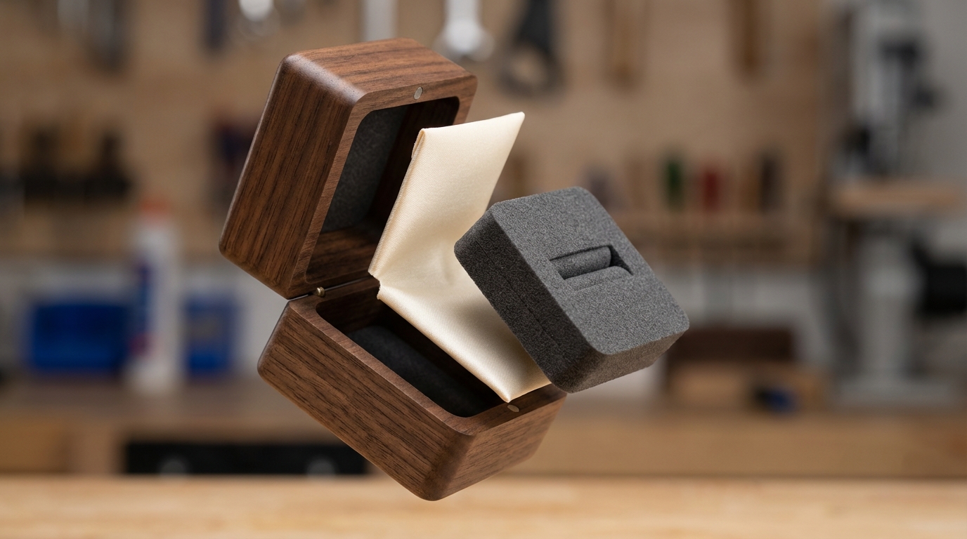 A velvet-wrapped foam insert takes up significant space within the box shell. If the foam is too dense, it may be difficult to push the ring into the slit; if it is too soft, the ring may flop to the side, ruining the presentation.