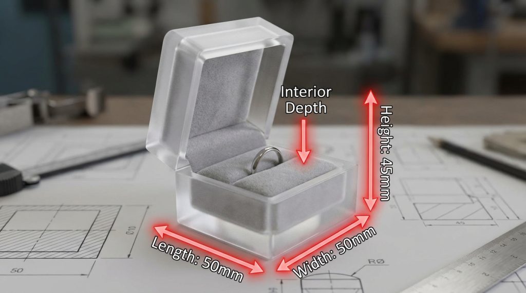 Here is the problem: many people choose a box based purely on the exterior footprint without checking the internal clearance. If your ring box size is too shallow, the lid will exert physical pressure on the prongs of a high-set stone every time it is closed.